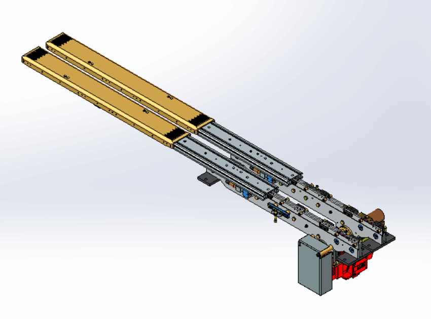 货叉一般是3-4节 是由驱动电机控制货叉伸缩,插取货物。货叉可以左右伸缩取货。